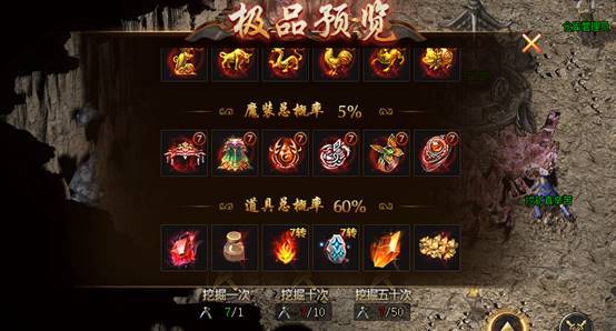 嗜血宝钻、装备保护油、地狱火、天精岩、元宝、内功丹、经验卷轴等