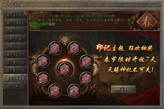 活动说明 :活动期间,高转装备、神装、星座、生肖等极品道具概率翻倍,极品印记限时抽取!