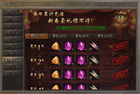 活动说明 : 活动期间,每天累计充值满足68元、328元、648元、1000元均可领取一份累充豪礼,连续累充多天可多次领取!