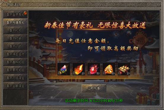 活动说明 : 活动期间,每天充值任意金额,即可领取节日每日充值奖励。