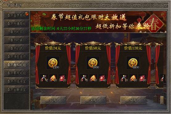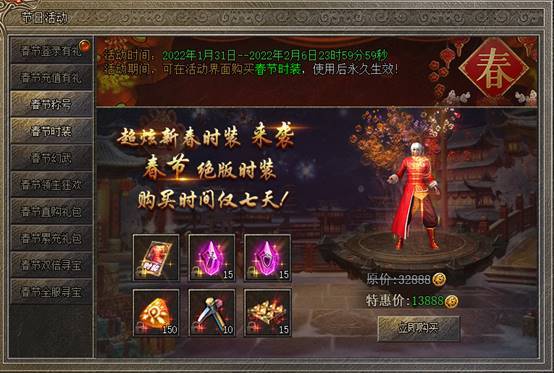 活动说明 : 活动期间,可在活动界面购买春节时装,使用后永久生效!