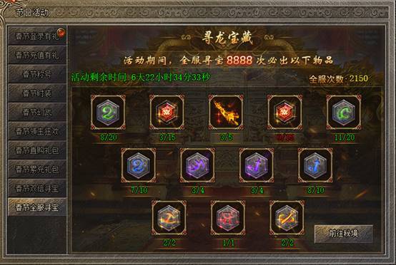 活动说明 : 活动期间,全服寻宝8888次,必出以下奖励表中所有物品。