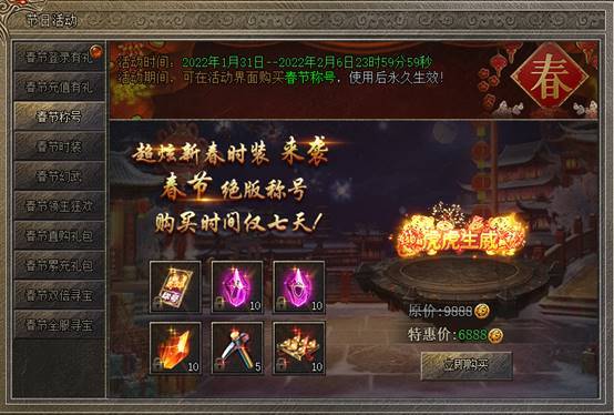活动说明 : 活动期间,可在活动界面购买春节称号,使用后永久生效!