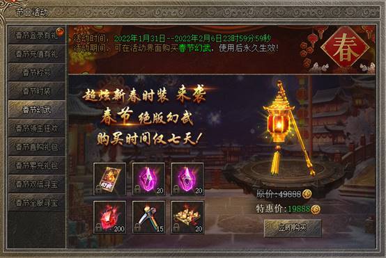 活动说明 : 活动期间,可在活动界面购买春节幻武,使用后永久生效!